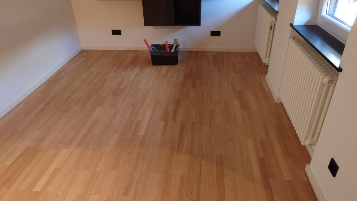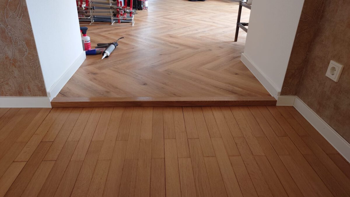 Komplette Sanierung eine Wohnung mit der Aufbereitung des vorhandenen Parkettbodens , und eine Neuverlegung eines Designbelags in Fischgrät